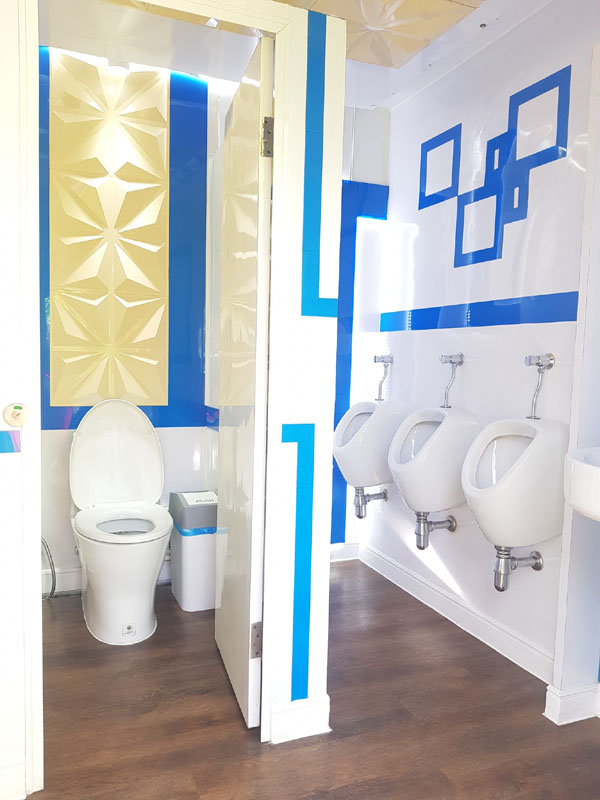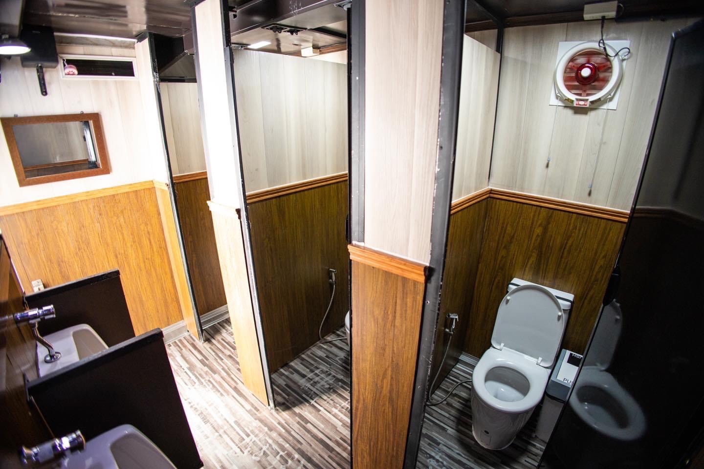ภายในรถสุขาเคลื่อนที่แยกเป็นห้องน้ำชาย และห้องน้ำหญิง